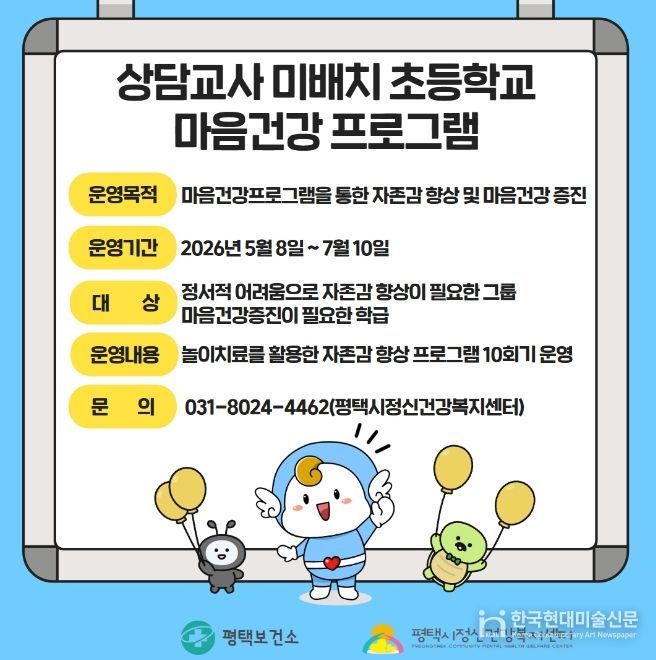 한국현대미술신문 배윤섭 기자 | 평택시는 상담교사가 배치되지 않은 초등학교 학생들의 정신건강 지원을 위해 ‘마음건강 프로그램’을 운영한다고 밝혔다.