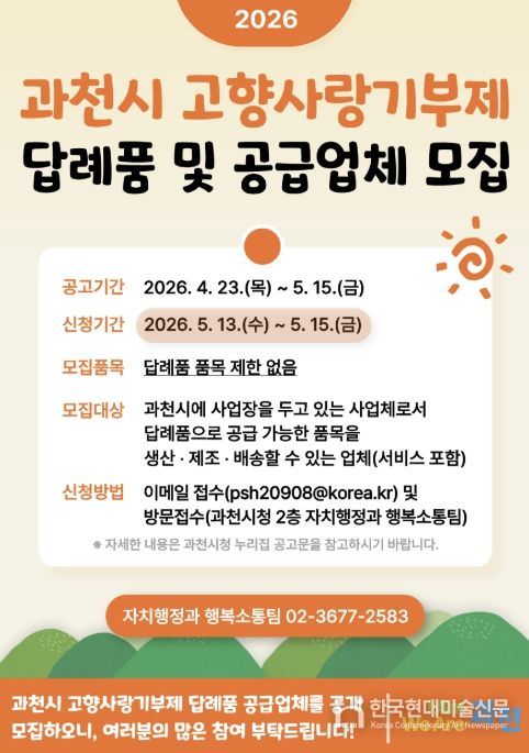 한국현대미술신문 배윤섭 기자 | 과천시는 고향사랑기부제 활성화를 위해 답례품 공급업체를 공개 모집한다고 밝혔다.