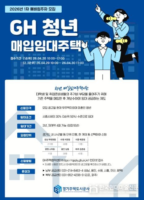 한국현대미술신문 배윤섭 기자 | 경기주택도시공사(GH)가 청년층 주거 부담을 덜고 안정적인 생활 기반을 마련할 수 있도록 청년 및 자립준비 청년을 위한 매입임대주택 예비입주자 396명을 모집한다고 27일 밝혔다.