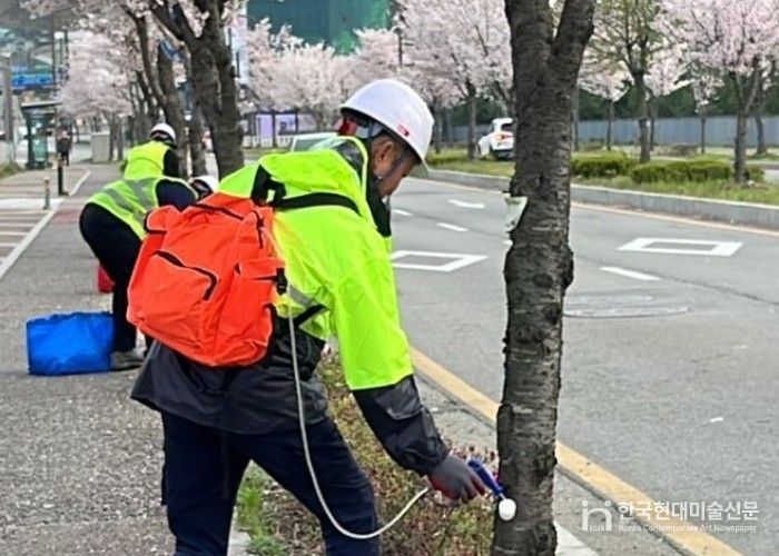 한국현대미술신문 배윤섭 기자 | 화성특례시 만세구는 최근 증가하는 식엽성 해충 피해에 대응하기 위해 주요 벚나무길을 중심으로 수간주사 방제를 실시했다고 27일 밝혔다.