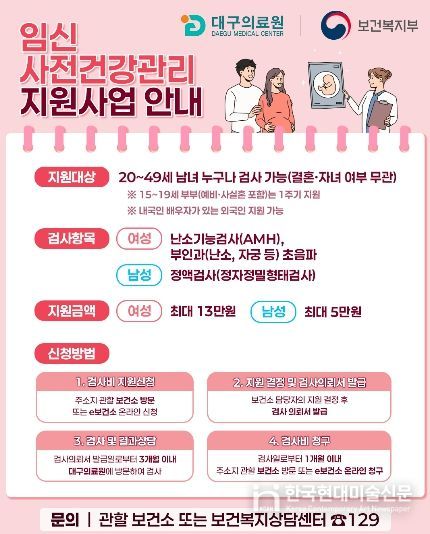 한국현대미술신문 정소영 기자 | 대구의료원 난임센터는 임신·출산에 장애가 될 수 있는 건강 위험요인을 조기에 발견하기 위한 ‘임신 사전건강관리 지원사업’ 참여의료기관으로 선정돼, 지역 주민의 건강한 임신·출산 환경 조성을 적극 지원한다.