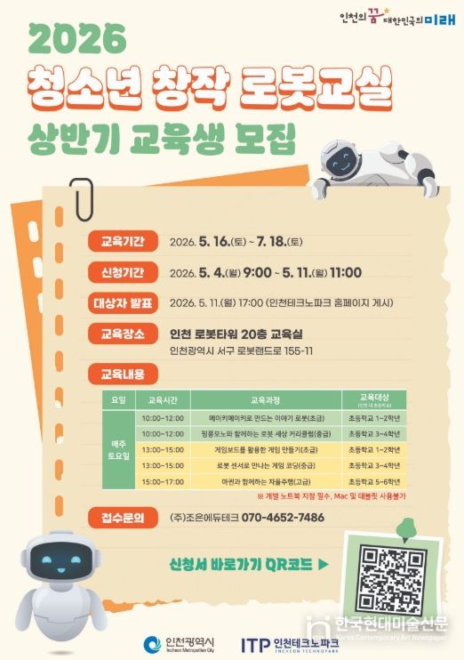 한국현대미술신문 박재남 기자 | 인천테크노파크(인천TP)는 인천 관내 초등학생을 대상으로 로봇과 인공지능(AI)기술을 직접 체험하는 ‘2026년 청소년 창작 로봇교실’ 상반기 교육생을 5월 11일까지 모집한다고 밝혔다.