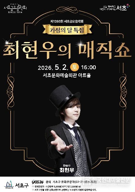 한국현대미술신문 배건 기자 | 서울 서초구가 가정의 달 5월을 맞아 오는 5월 2일 토요일 오후 4시, 서초문화예술회관 아트홀에서 서초토요콘서트 '최현우의 매직쇼'를 개최한다고 밝혔다.