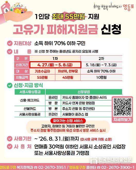 한국현대미술신문 배건 기자 | 영등포구가 계속되는 고유가 상황 속에서 구민들의 경제적 부담을 완화하기 위해 ‘고유가 피해지원금’ 지급에 나선다고 밝혔다. 이번 지원금은 2026년 3월 30일을 기점으로 소득하위 70% 이하인 구민을 대상으로 하며, 소득 수준에 따라 차등 지급된다.