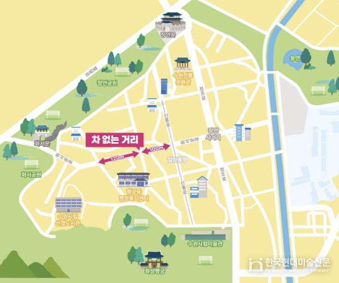 한국현대미술신문 배윤섭 기자 | 수원시 행궁동 화서문로 34번지부터 신풍로 47번지까지 약 220m 구간이 5월부터 매주 토요일 ‘차 없는 거리’로 운영된다.
