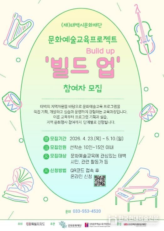 한국현대미술신문 원진 기자 | (재)태백시문화재단은 지역 문화예술교육 인력 양성과 지속 가능한 문화예술 생태계 조성을 위해 '2026 태백 문화예술교육 프로젝트 ‘빌드 업(Build up)’' 참여자를 모집한다.