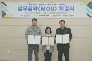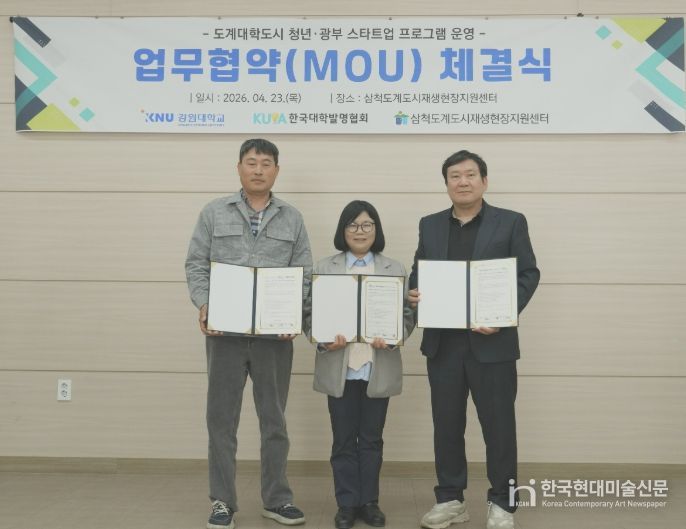 한국현대미술신문 원진 기자 | 삼척도계도시재생현장지원센터는 4월 23일 센터에서 강원대학교 도계운영본부, 사단법인 한국대학발명협회와 함께 ‘도계대학도시 청년·광부 스타트업 프로그램 운영’을 위한 업무협약(MOU)을 체결했다.