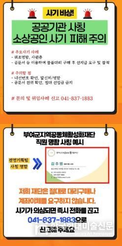 한국현대미술신문 신정은 기자 | 부여군 지역공동체활성화재단은 최근 재단 직원을 사칭하여 물품 구매를 요청하는 의심 사례가 확인됨에 따라, 지역 소상공인과 협력업체를 대상으로 피해 예방 안내에 나섰다고 밝혔다.