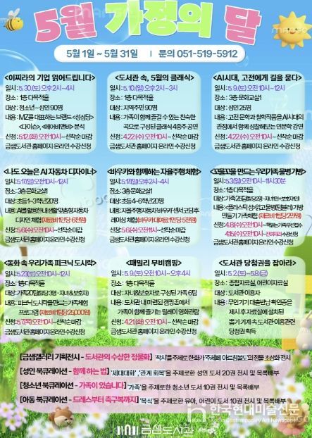 한국현대미술신문 정소영 기자 | 부산 금정구 금샘도서관은 5월 가정의 달을 맞아 오는 5월 1일부터 31일까지 작가(유튜버) 강연, 클래식 공연, 체험행사 등 온 가족이 함께 즐길 수 있는 '가정의 달' 특별 프로그램을 운영한다고 밝혔다.