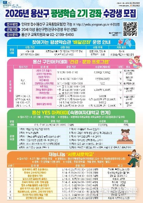 한국현대미술신문 배건 기자 | 서울 용산구가 구민의 자기계발과 평생학습 참여 기회 확대를 위해 ‘2026년 평생학습 2기 강좌’를 본격적으로 운영하고, 수강생 모집에 나섰다.