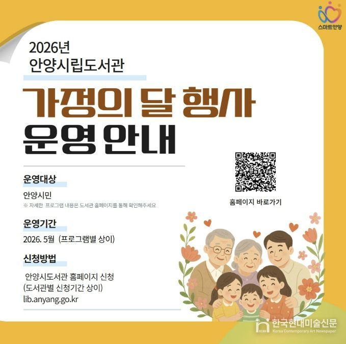 한국현대미술신문 배윤섭 기자 | 안양시도서관은 5월 가정의 달을 맞아 어린이와 부모가 함께하는 체험프로그램, 가족공연, 인문학 강연, 생활문화 강좌, 전시 등 다양한 행사를 마련했다.