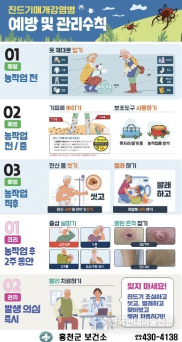 홍천군보건소는 2026년 진드기 매개 감염병 예방 사업을 추진하고 있다. 농업기술센터, 군부대, 경로당 등과 연계해 진드기 노출 위험이 큰 고위험군을 대상으로 예방 교육을 시행하고 있으며, 지역 축제와 면민 체육대회 현장에서도 주민 대상 홍보 활동을 이어가고 있다.