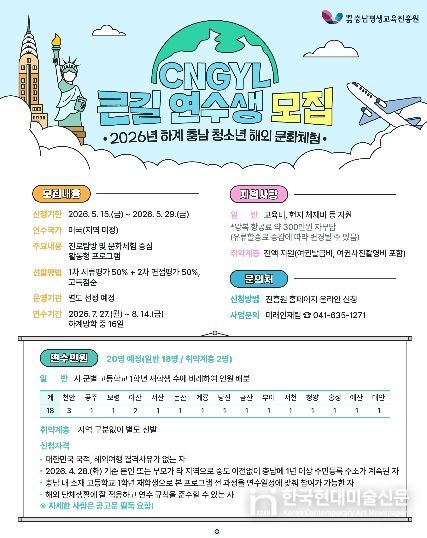 한국현대미술신문 신정은 기자 | (재)충남평생교육진흥원은 도내 청소년들이 미국 현지에서 다양한 문화를 체험하고 자신의 진로를 탐색할 수 있도록'2026년 충남 청소년 해외 문화체험 큰길(CNGYL) 프로그램'하계 연수생을 모집한다.