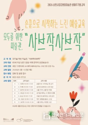 한국현대미술신문 기자 | 남원시립김병종미술관은 오는 5월부터 11월까지 실버세대를 위한 생애주기별 예술교육 프로그램 '모두를 위한 미술관, ‘사브작사브작’' 을 운영한다고 밝혔다.