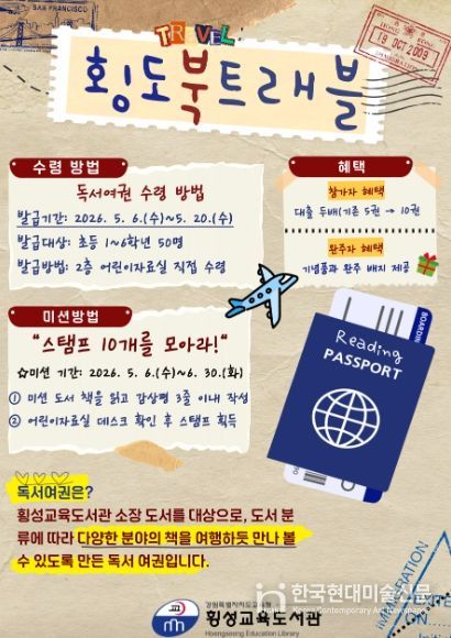 한국현대미술신문 원진 기자 | 횡성교육도서관은 5월 6일부터 6월 30일까지 어린이들의 자발적인 독서 습관 형성과 도서관 이용 활성화를 위해 독서 여권을 활용한 ‘횡도북트래블’ 프로그램을 운영한다고 밝혔다.