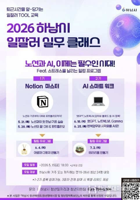 한국현대미술신문 배윤섭 기자 | 하남시는 관내 청년들이 현장에서 바로 활용할 수 있는 실무 역량을 키우고 또래 청년 간 교류 기회를 확대하기 위해 오는 5월부터 ‘2026년 하남시 일잘러 실무클래스’를 운영하고 1기와 2기 참여자를 모집한다고 밝혔다.