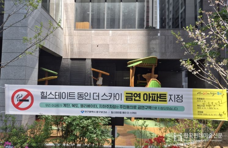 한국현대미술신문 정소영 기자 | 대구 중구는 공동생활공간에서 발생하는 간접흡연 피해로부터 주민을 보호하고 쾌적한 금연 환경을 조성하기 위해 ‘힐스테이트 달성공원역’(중구 태평로 41)과 ‘힐스테이트 동인 더 스카이’(중구 태평로 240)를 각각 제26호, 제27호 공동주택 금연구역으로 지정했다.