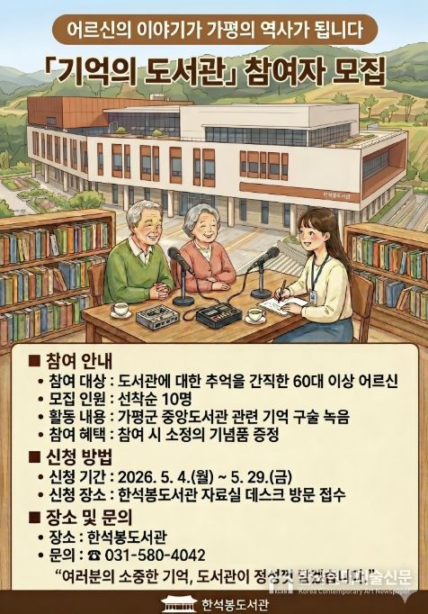 한국현대미술신문 배윤섭 기자 | 가평군 한석봉도서관이 오는 5월부터 어르신들의 생생한 목소리로 지역의 옛 기록을 수집하는 ‘기억의 도서관’ 프로그램을 운영한다. 실버층 특화 사업인 ‘말랑말랑 추억 교실’의 일환으로 추진되는 이번 사업은 지역 문화 자산을 확보하고 세대 간 기억을 공유하고자 기획됐다.