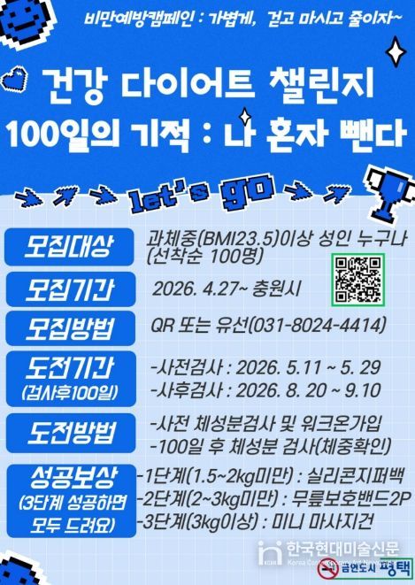 한국현대미술신문 배윤섭 기자 | 평택시는 시민들이 스스로 비만 관리 능력을 키우고 건강한 생활 습관을 정착시킬 수 있도록 돕는 비만 예방 프로그램 '100일의 기적’참가자를 모집한다고 밝혔다.
