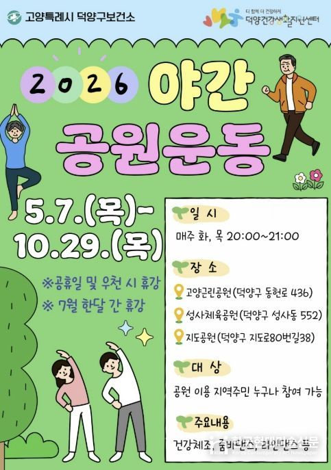 한국현대미술신문 배윤섭 기자 | 고양특례시 덕양구보건소는 오는 5월 7일부터 야간공원 운동교실을 운영한다.