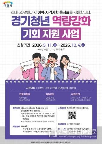 한국현대미술신문 배윤섭 기자 | 이천시가 오는 5월 11일부터 미취업 청년의 어학·자격시험 응시료를 지원하는 ‘경기청년 역량강화 기회지원 사업’ 대상자 모집에 들어간다.