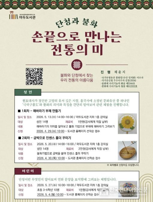 한국현대미술신문 배윤섭 기자 | 고양특례시 마두도서관은 오는 5월, 단청과 불화를 주제로 우리 전통의 아름다움을 체험할 수 있는 프로그램 ‘손끝으로 만나는 전통의 미’를 운영한다.