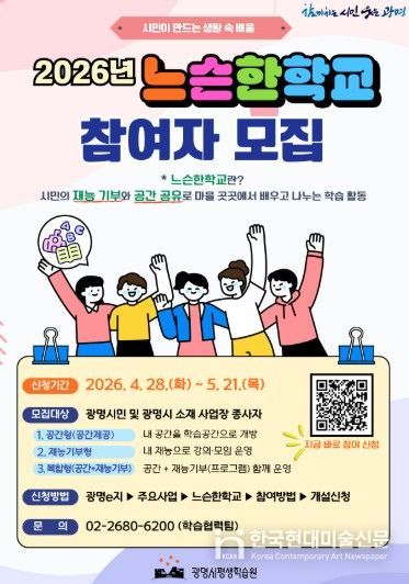 한국현대미술신문 배윤섭 기자 | 광명시가 시민이 직접 가르치고 배우는 시민참여형 평생학습 프로그램 ‘느슨한학교’ 신규 운영자를 오는 5월 21일까지 모집한다.