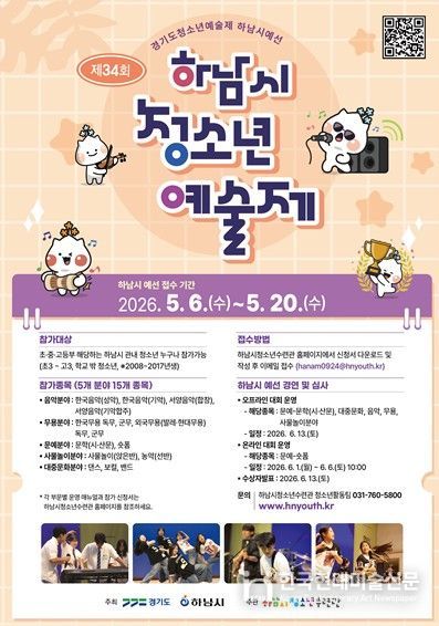 한국현대미술신문 배윤섭 기자 | 하남시가 주최하고 하남시청소년수련관이 주관하는 ‘2026 제34회 하남시청소년예술제’가 오는 6월 13일 하남시청소년수련관에서 개최된다.