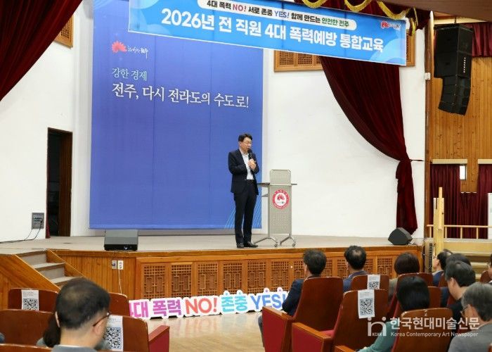 한국현대미술신문 기자 | 전주시는 28일 시청 강당에서 우범기 전주시장을 비롯한 5급 이상 간부 공무원 100여 명을 대상으로 ‘2026년 직장 내 4대 폭력 예방 통합교육’을 실시했다.