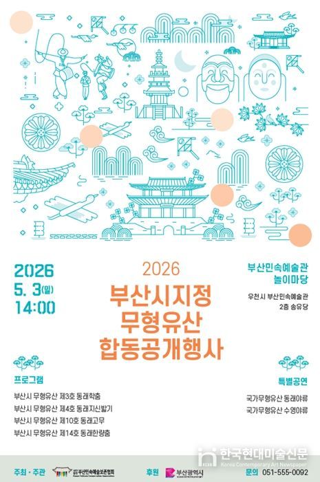 한국현대미술신문 정소영 기자 | 부산시는 오는 5월 3일 오후 2시 부산시 무형유산 전수교육관인 '부산민속예술관 놀이마당'에서 무형유산의 보존과 원형 전승을 위한 '2026 부산광역시 지정 무형유산 합동 공개행사'를 개최한다고 밝혔다.
