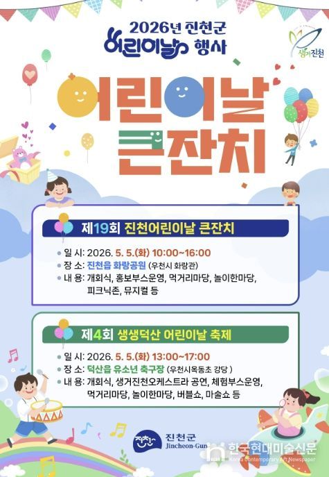 한국현대미술신문 신정은 기자 | 충북 진천군은 제104회 어린이날을 맞아 5월 5일 진천읍 화랑공원과 덕산읍 유소년축구장 두 곳에서 어린이날 기념행사를 개최한다고 밝혔다.