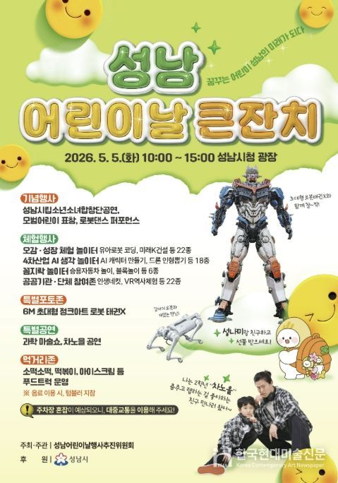 한국현대미술신문 배윤섭 기자 | 성남시는 오는 5월 5일 시청 광장과 1층 온누리에서 ‘어린이날 큰잔치’를 개최한다.