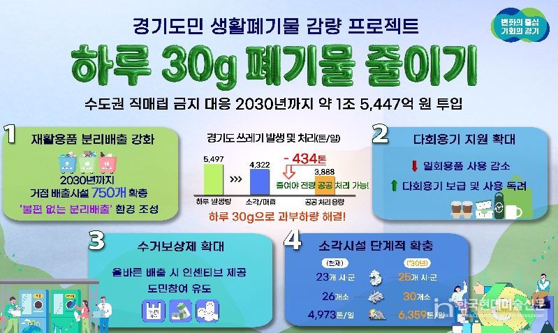 한국현대미술신문 배윤섭 기자 | 수도권 직매립 금지에 따른 생활쓰레기 감량을 위해 경기도가 2030년까지 5년간 약 1조 5,447억 원을 투입하는 ‘하루 30g, 도민실천형 생활폐기물 감량 프로젝트’를 추진한다.