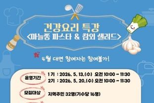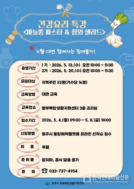 한국현대미술신문 원진 기자 | 원주시 동부복합생활지원센터는 다음 달 4일부터 ‘마늘쫑 파스타·참외 샐러드 만들기’ 건강 요리 특강 프로그램 참여자를 모집한다.