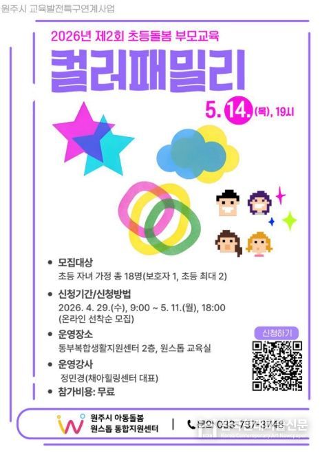 한국현대미술신문 원진 기자 | 원주시 아동돌봄 원스톱통합지원센터는 다음 달 14일 오후 7시, 관내 초등학생 자녀와 보호자를 대상으로 가족 간의 이해와 소통을 돕는 부모교육 프로그램 ‘컬러패밀리’를 운영한다.