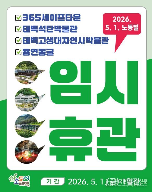 한국현대미술신문 원진 기자 | 태백시는 오는 5월 1일 근로자의 날을 맞아 관내 주요 관광시설에 대해 임시 휴관을 실시한다고 밝혔다.