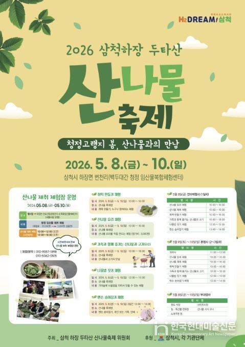 한국현대미술신문 원진 기자 | 삼척시는 2026년 제13회 ‘삼척 하장 두타산 산나물 축제’가 5월 8일부터 10일까지 백두대간 청정임산물 복합체험센터(삼척시 하장면 두타로 499) 일원에서 개최된다고 밝혔다.