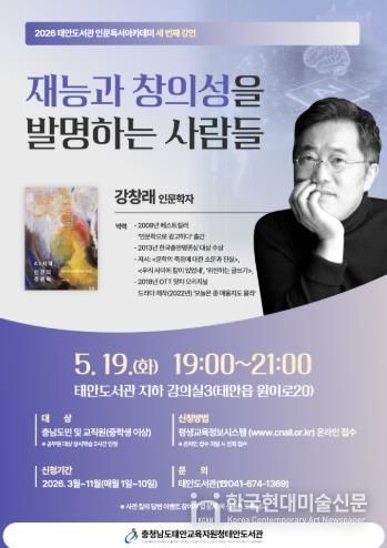 한국현대미술신문 신정은 기자 | 충청남도태안교육지원청태안도서관은 오는 5월 19일 오후 7시 도서관 지하 강의실에서 ‘재능과 창의성을 발명하는 사람들’을 주제로 인문독서 아카데미를 운영할 예정이다.