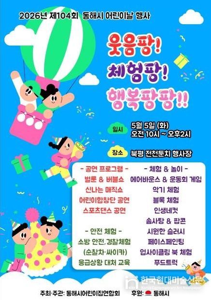 한국현대미술신문 원진 기자 | 동해시는 어린이들이 안전하고 행복한 환경 속에서 마음껏 꿈을 키울 수 있도록 오는 5월 5일 전천 일원에서 어린이날 기념행사를 개최한다고 밝혔다.