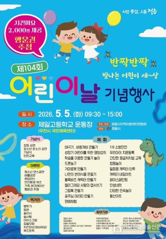 한국현대미술신문 기자 | 정읍시는 다가오는 제104회 어린이날을 맞아 오는 5월 5일 정읍제일고등학교 운동장(우천 시 국민체육센터)에서 어린이날 기념행사를 개최한다.