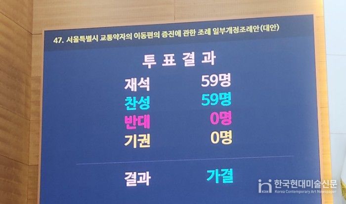 한국현대미술신문 배윤섭 기자 | 서울특별시의회 문성호 의원(국민의힘‧서대문2)이 발의한 '서울특별시 교통약자의 이동편의 증진에 관한 조례 일부개정조례안'(의안번호 3659)이 지난 4월 28일 열린 제333회 임시회 본회의에서 재석 의원 59명 전원 만장일치로 가결됐다.