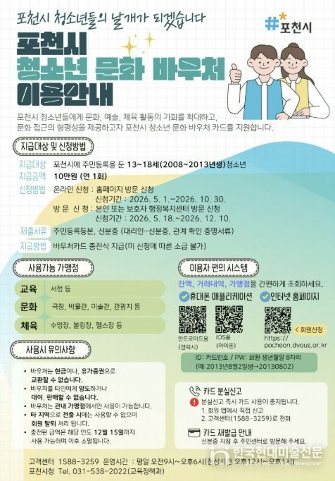 한국현대미술신문 배윤섭 기자 | 포천시는 청소년의 문화 접근성을 높이고 다양한 체험 기회를 제공하기 위해 ‘포천시 청소년 문화 바우처 지원사업’을 본격 시행한다.