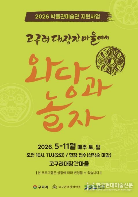한국현대미술신문 배윤섭 기자 | 구리시는 오는 5월 2일부터 11월 1일까지 매주 주말 고구려대장간마을에서 2026년 경기도 박물관·미술관 지원사업의 하나로 ‘고구려대장간마을에서 와당과 놀자’ 체험 행사를 운영한다고 밝혔다.