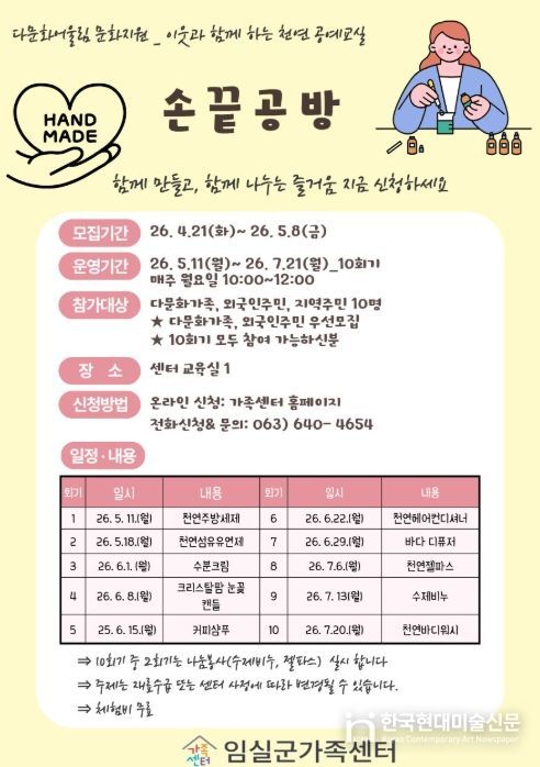 한국현대미술신문 기자 | 임실군 가족센터는 다문화가족·외국인주민·지역주민이 함께 천연 생활용품을 만들고 나누며 이웃 간 따뜻한 소통과 어울림을 경험할 수 있는 천연공예 프로그램 '손끝공방' 참여자를 모집한다.