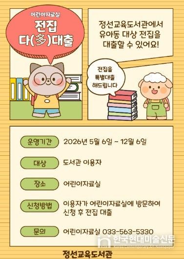 한국현대미술신문 원진 기자 | 정선교육도서관은 5월 6일부터 12월 6일까지 어린이자료실에서 어린이자료실 이용 활성화와 지역 내 독서 문화 확산을 위해 ‘전집다(多)대출’을 운영한다.