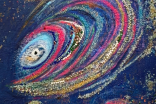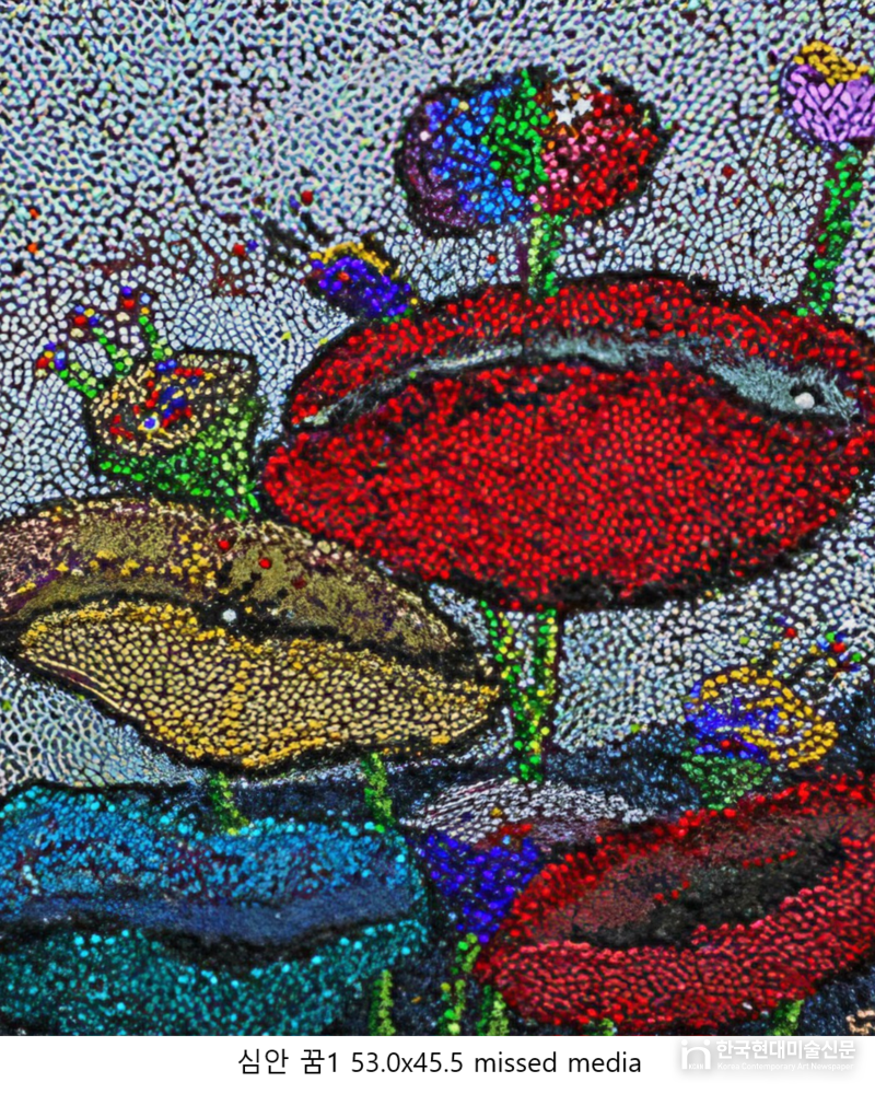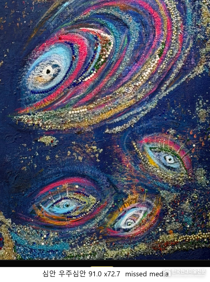 작가는 ‘심안 무언의 대화’, ‘심안 잔상’, ‘심안 꿈’, ‘우주심안’ 등의 연작을 통해 현실과 비현실, 의식과 무의식의 경계를 유영한다. 특히 반비구상적 화면 위에 보석과 글리터 등 반사 효과가 강한 재료를 촘촘히 쌓아 올리는 기법은 김수연만의 독보적인 조형 언어다. 캔버스 위에 응결된 빛의 입자들은 찰나의 감정들을 시각화하며, 보는 각도에 따라 끊임없이 변화하는 생명력을 부여한다.