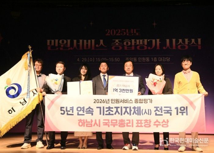 한국현대미술신문 배윤섭 기자 | 하남시가 전국 기초자치단체 중 최고 수준의 민원서비스 역량을 인정받으며 5년 연속 최우수 기관으로 선정됐다. 하남시는 29일 정부세종청사에서 열린 ‘2025년 민원서비스 종합평가’ 우수기관 시상식에서 국무총리 표창을 수상했다고 밝혔다.