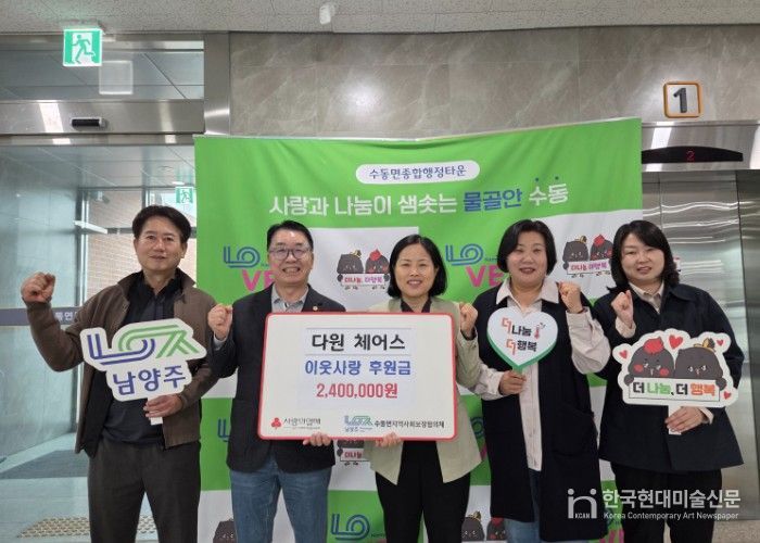 한국현대미술신문 배윤섭 기자 | 남양주시는 지난 28일 수동면 소재 다원체어스가 수동면 어르신들을 위한 후원금 240만 원을 수동면 지역사회보장협의체에 전달했다고 29일 밝혔다.