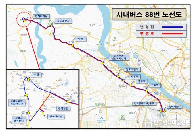 한국현대미술신문 배윤섭 기자 | 김포시가 5월 1일부터 시내버스 88번 노선의 강화군 구간을 변경 운행한다고 밝혔다.