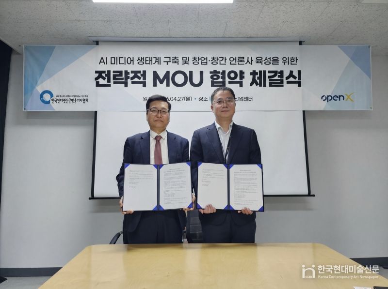 한국현대미술신문 김미정 기자 | 한국인터넷신문방송기자협회(회장 전병길, 이하 협회)와 오픈엑스(대표 김미진)는 지난 2026년 4월 27일 서울 상암동 DMC첨단산업센터에서 업무협약(MOU)을 체결하고, 제휴 언론사 육성과 건강한 미디어 생태계 강화를 위해 적극 협력하기로 뜻을 모았다.